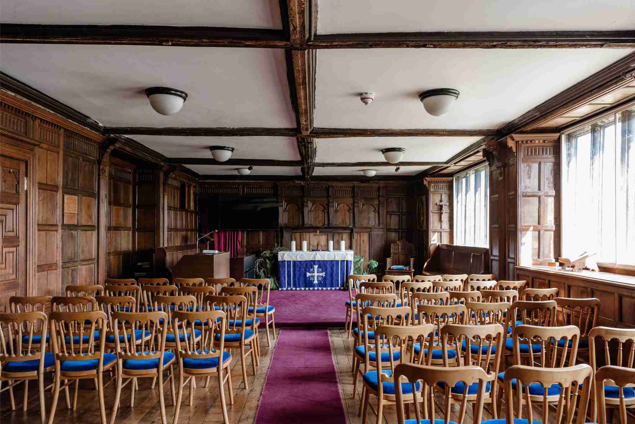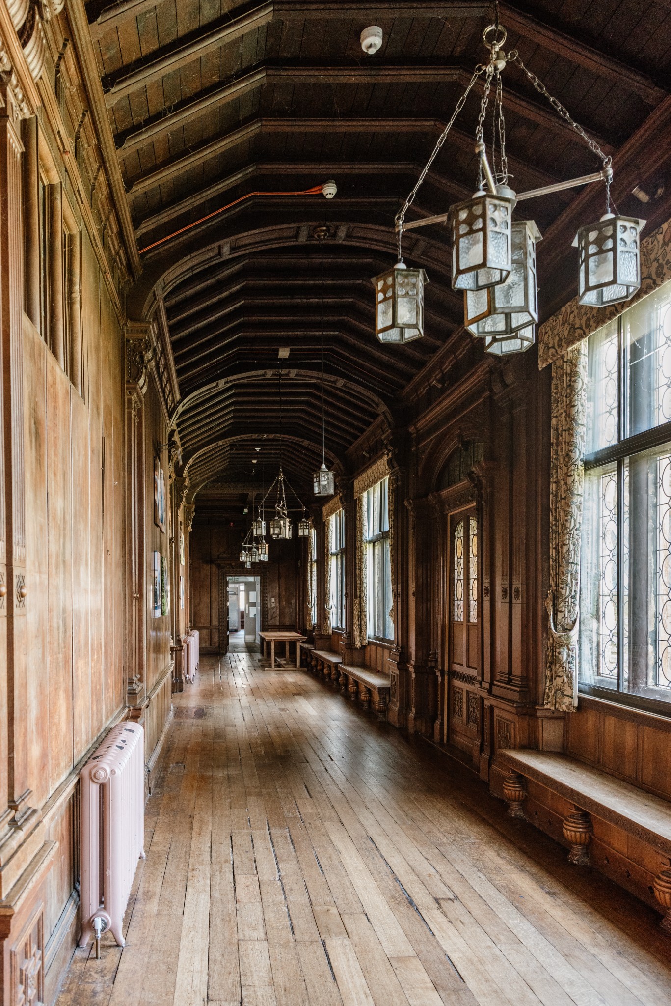 Larhus is an extensive gothic school which would be just amazing for period films, as well as photoshoots. The exterior is breath-taking with an incredible entrance arch with mullioned leaded light windows and ornate stonework, bell tower and carvings. The brick, stone and half timbered exterior is both rambling and imposing and very impressive.