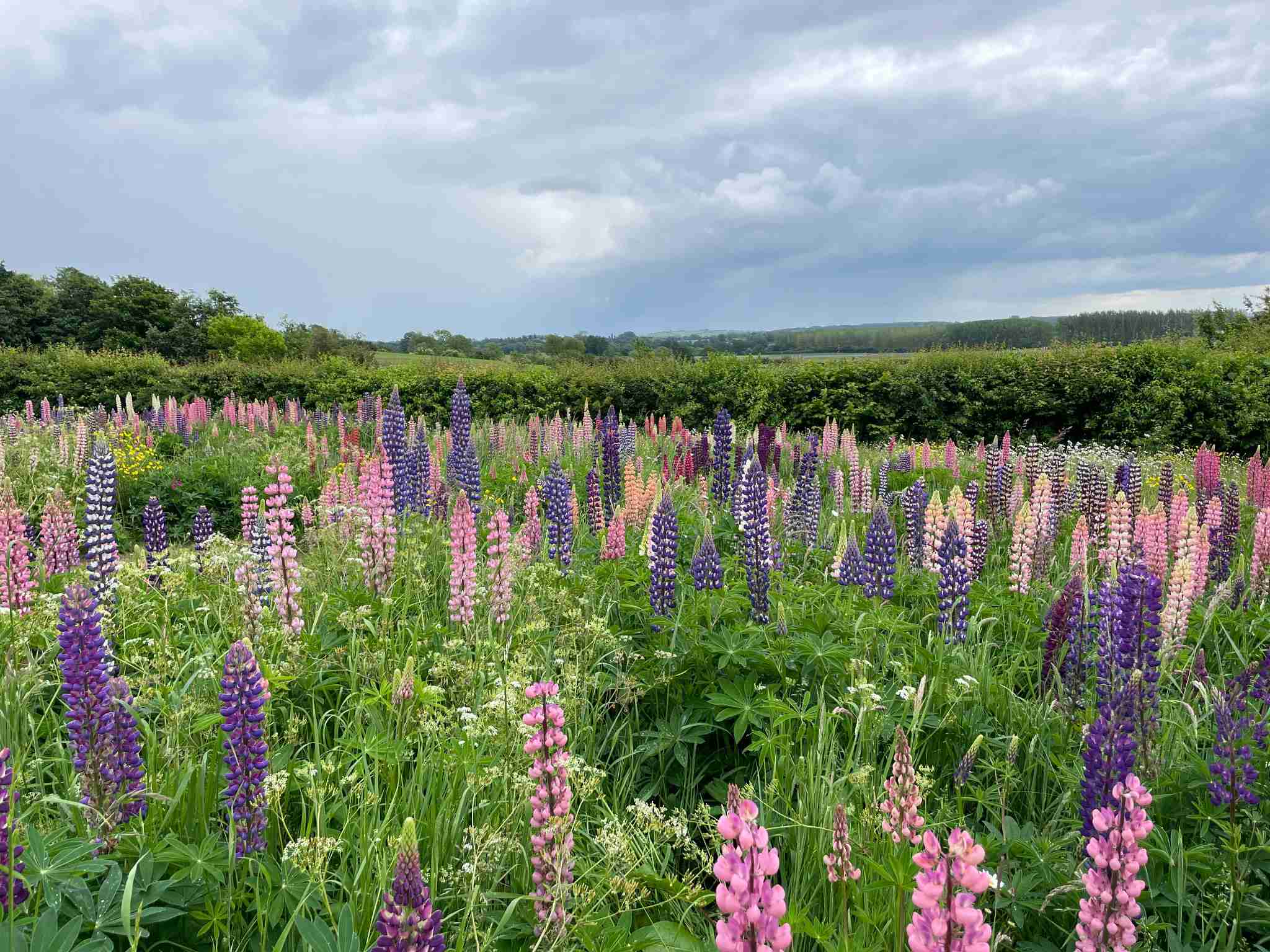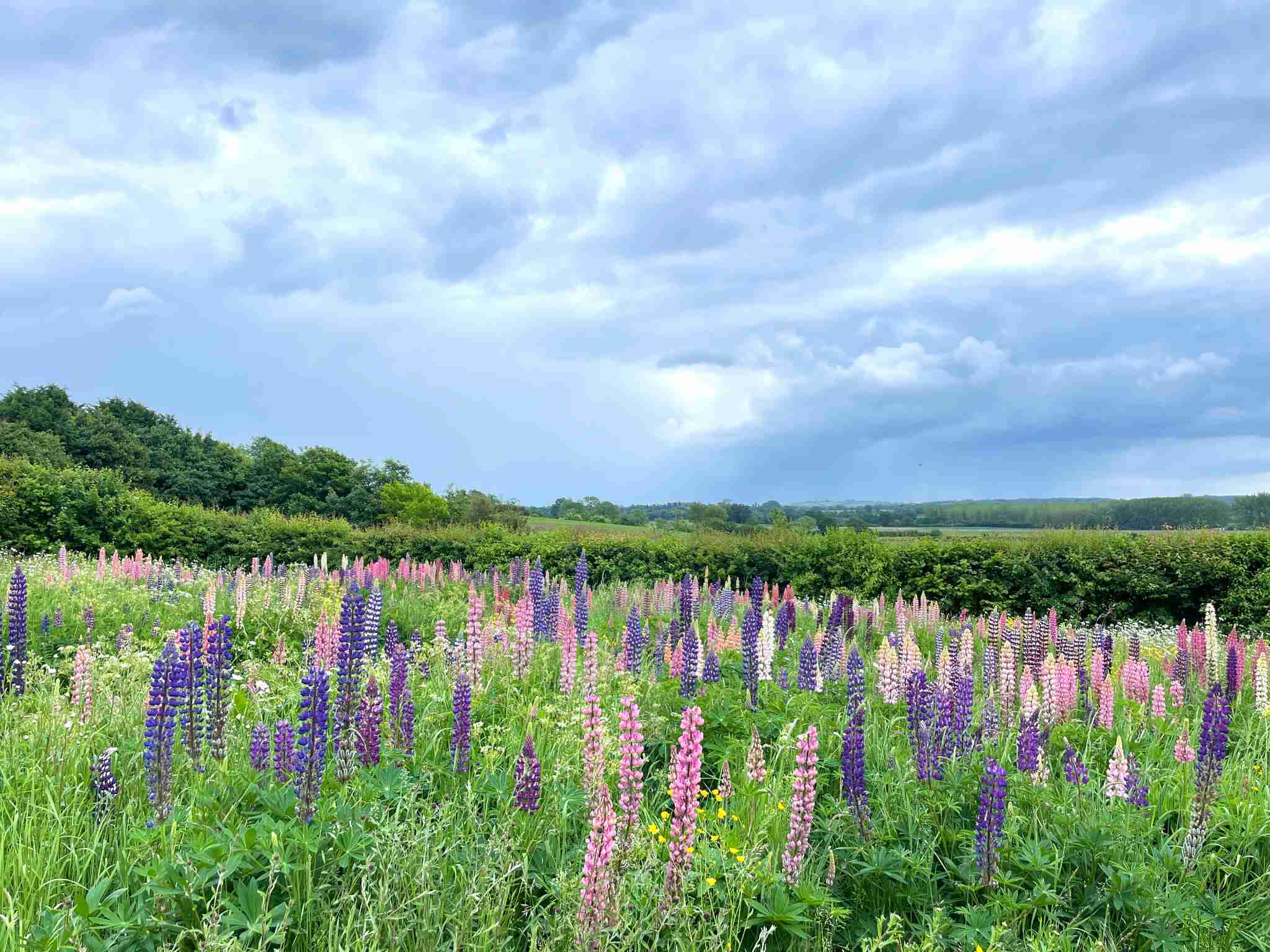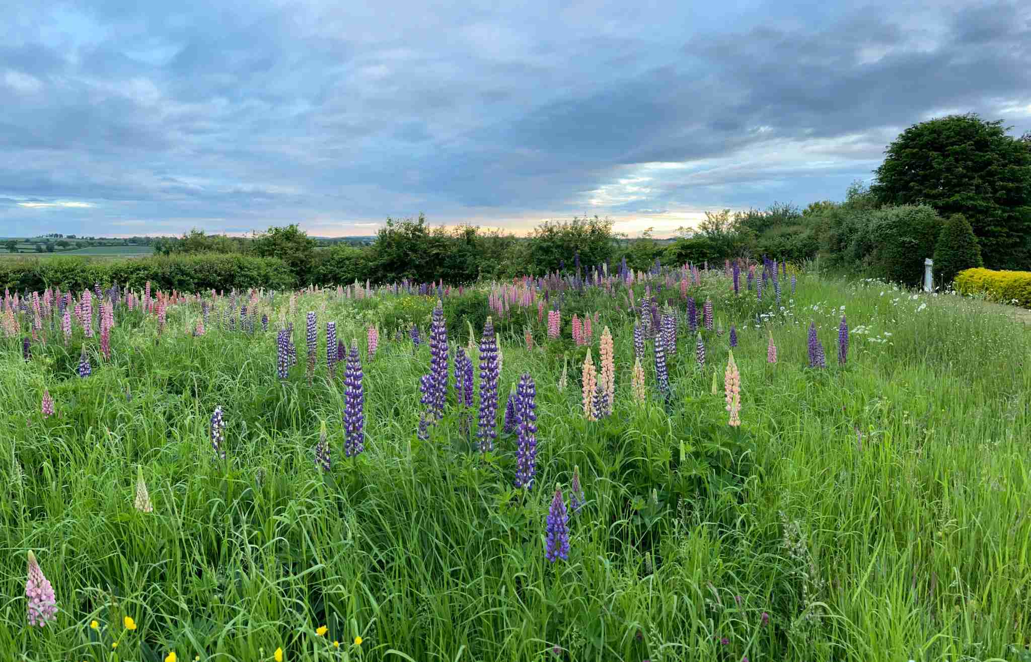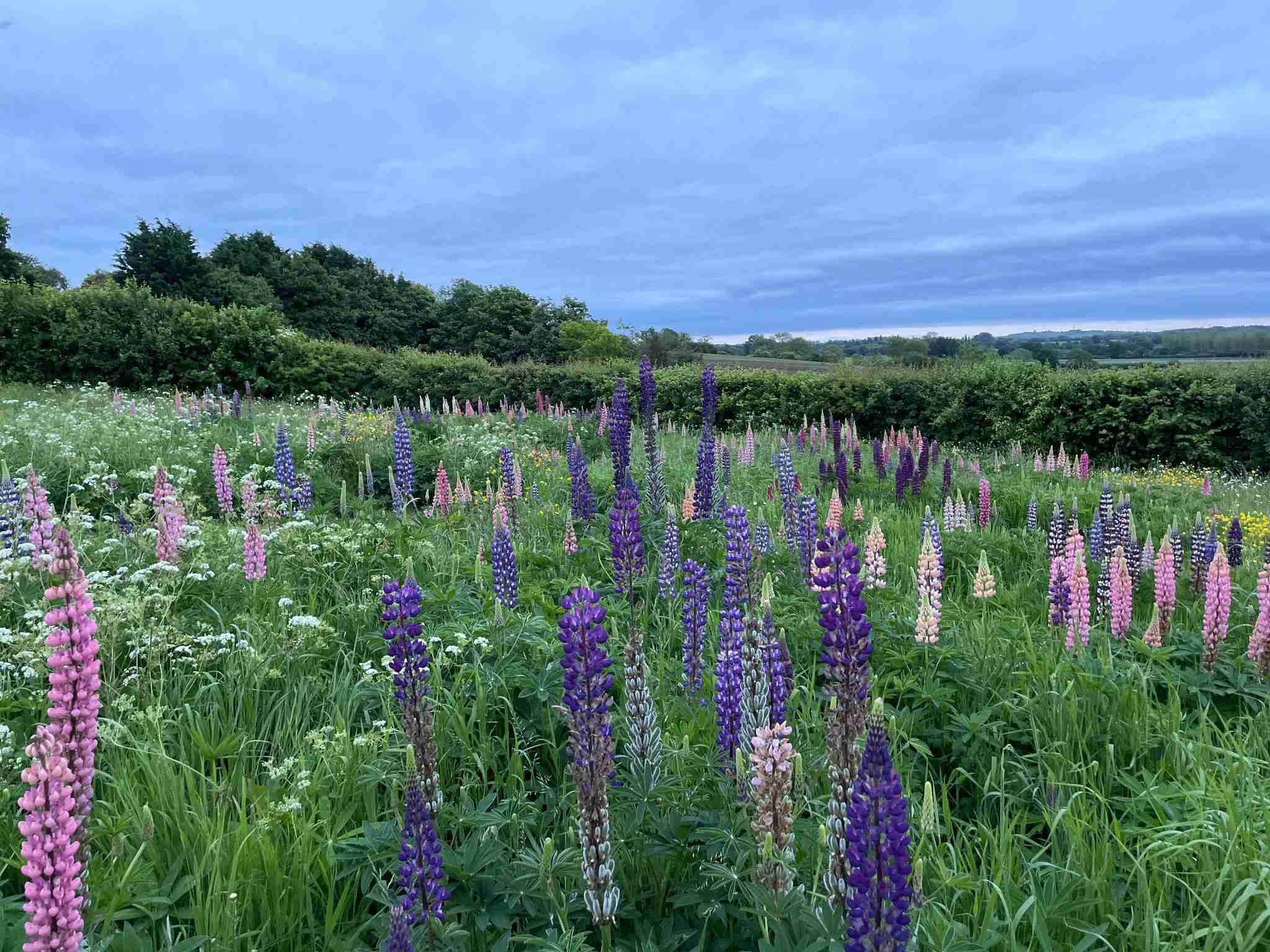 A glorious paddock with naturalised lupins in an array of colours as well as, buttercups, cow parsley and oxeye daisies. The paddock has far reaching countryside views to the south east across arable fields and woodland. The gradient of the meadow allows for some fantastic sunrises across the broad skyline it looks out to.