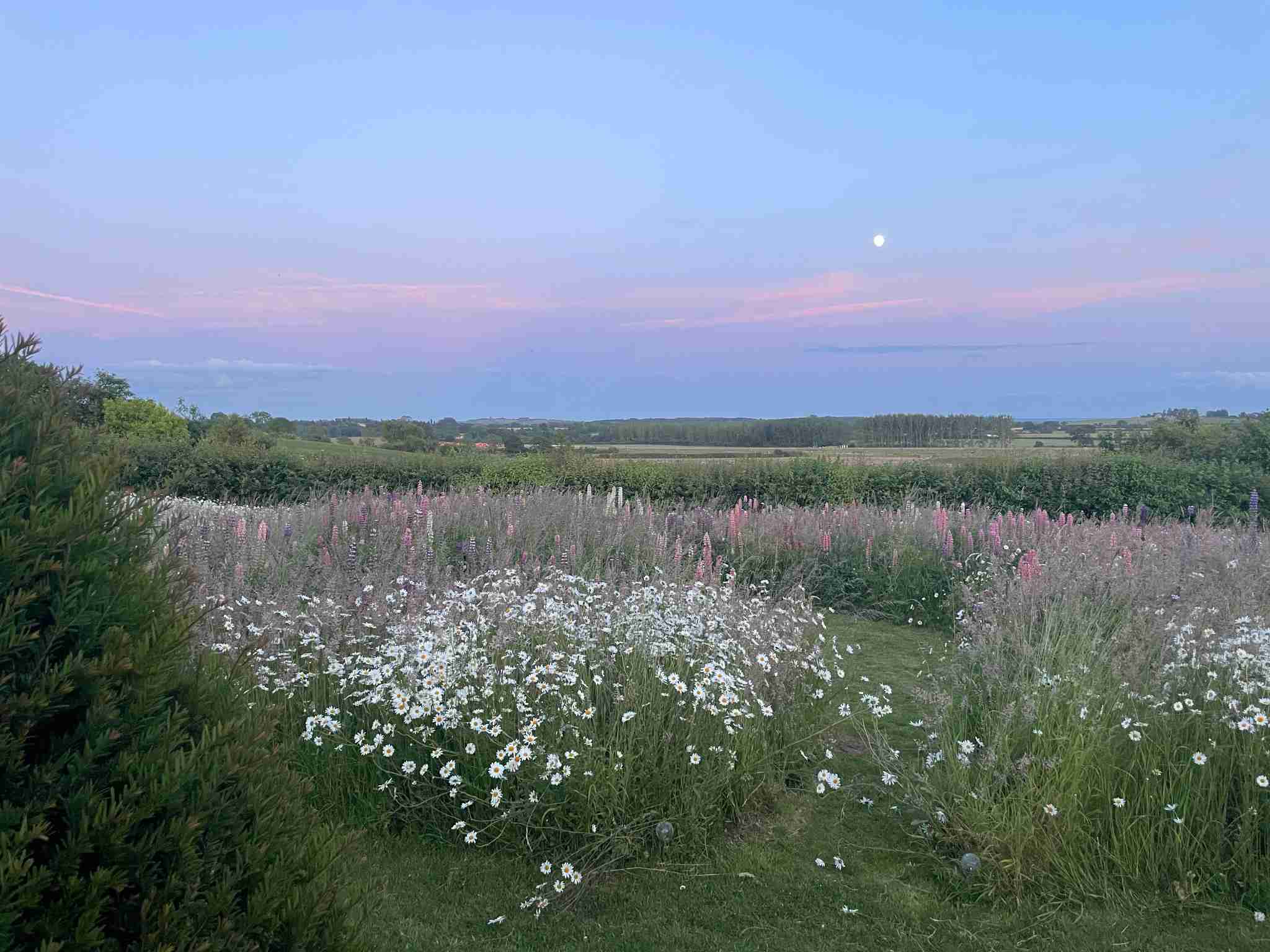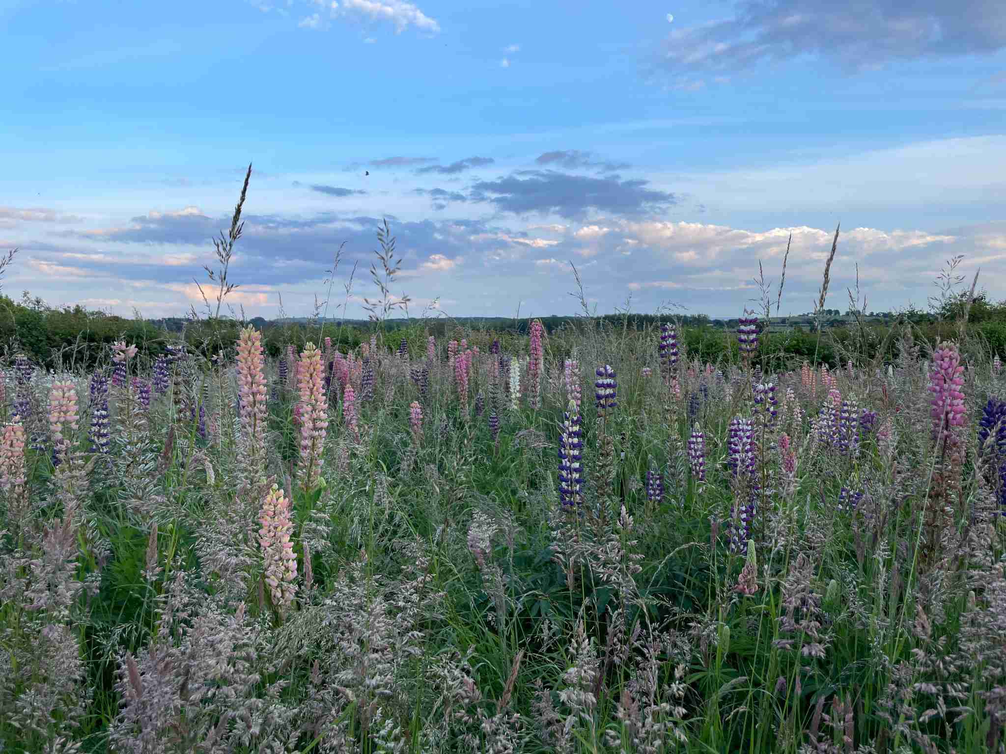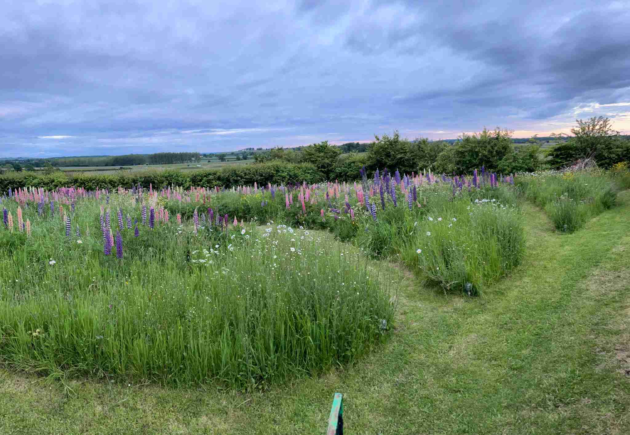A glorious paddock with naturalised lupins in an array of colours as well as, buttercups, cow parsley and oxeye daisies. The paddock has far reaching countryside views to the south east across arable fields and woodland. The gradient of the meadow allows for some fantastic sunrises across the broad skyline it looks out to.