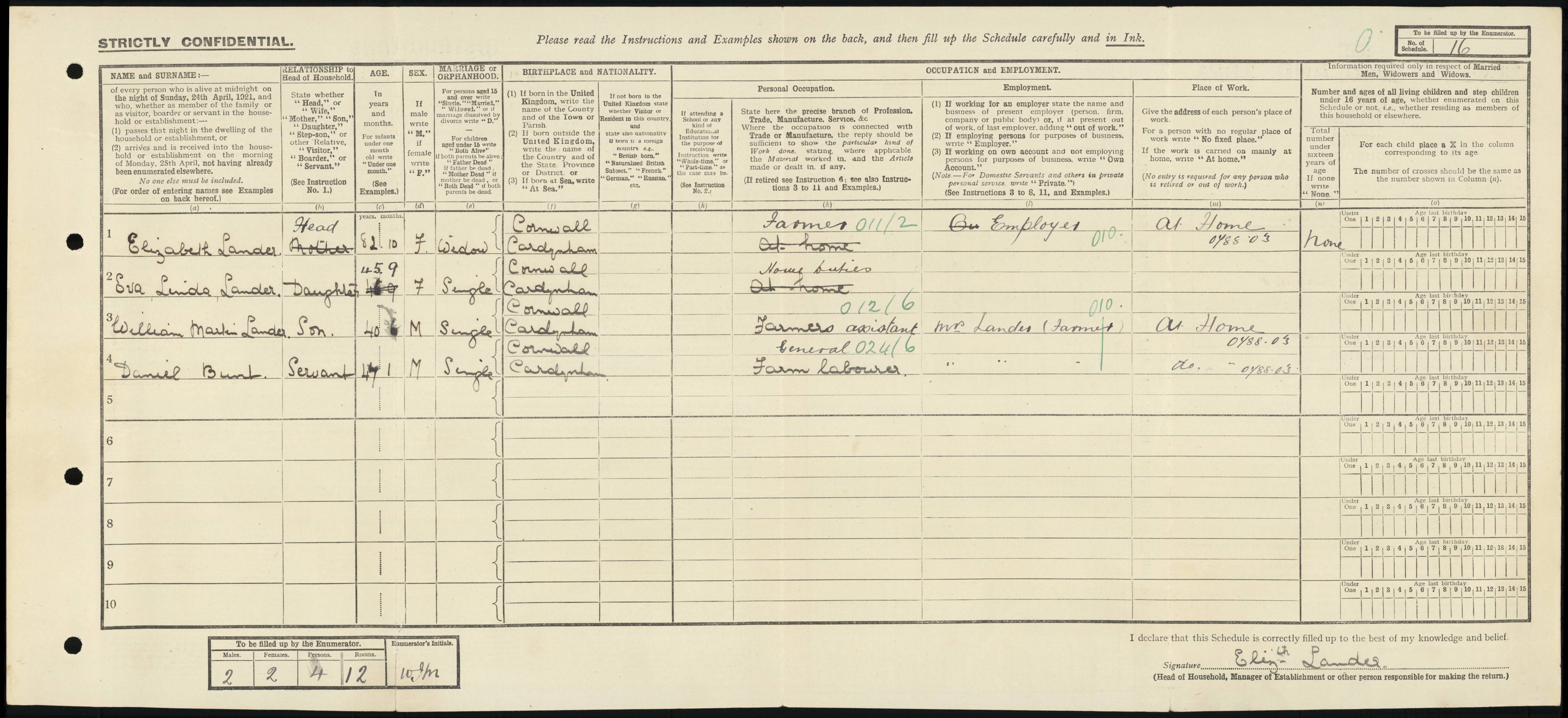 A decade later, the 1921 census shows Elizabeth still at Cabilla at 82, still listed as a farmer. Eva (45) and William (40) remained with her, and Daniel Bunt continued as their general farm labourer.