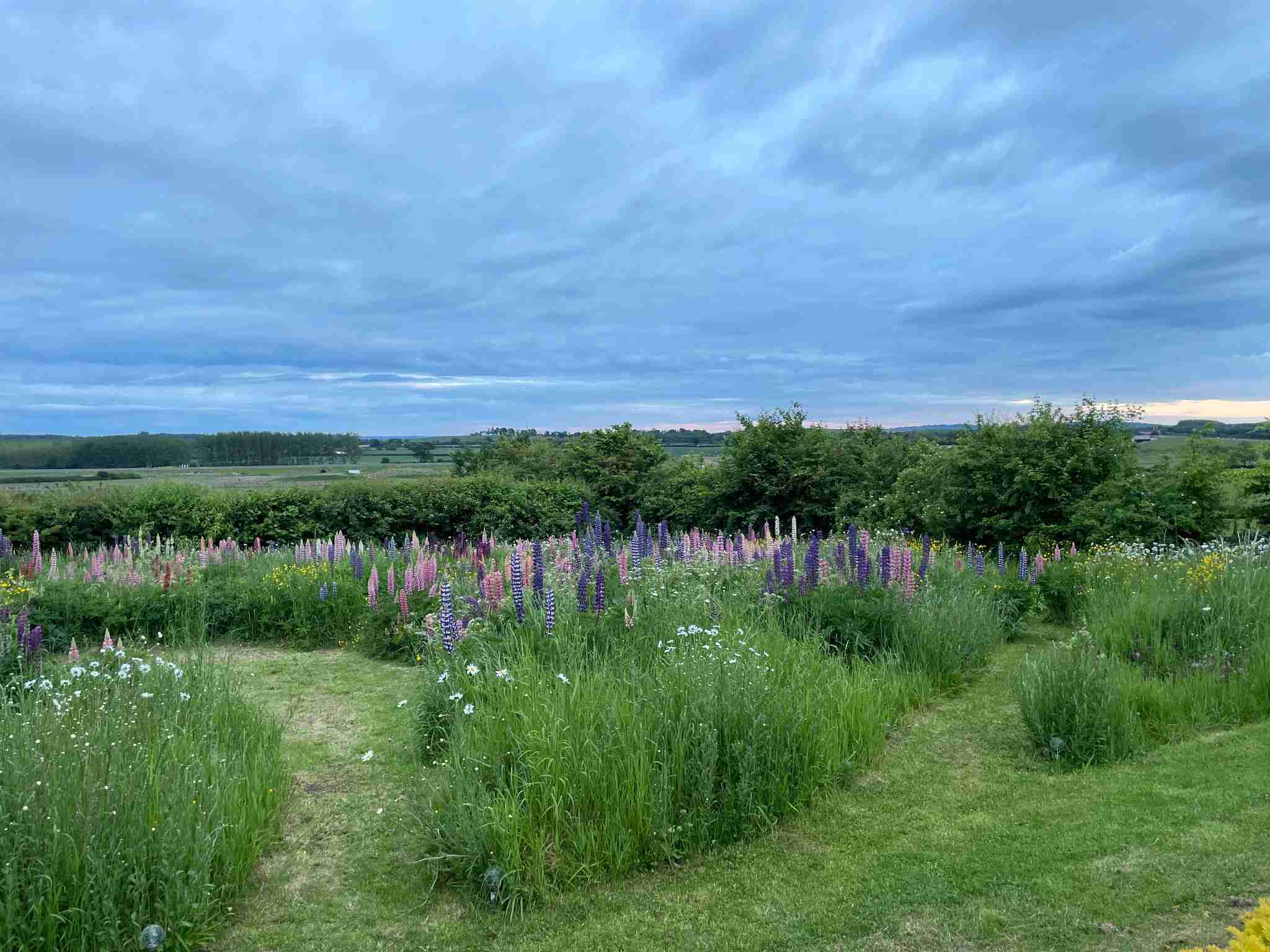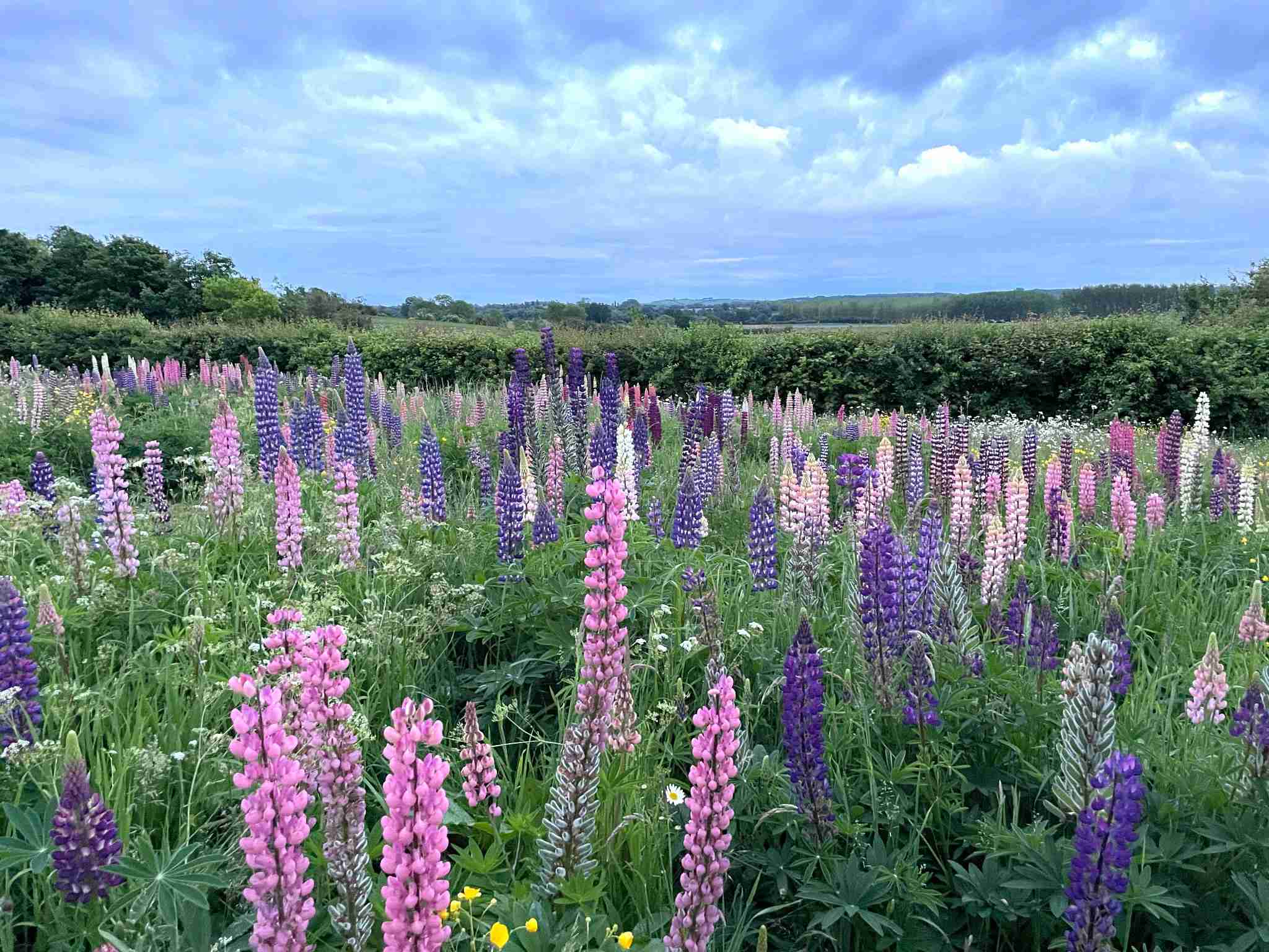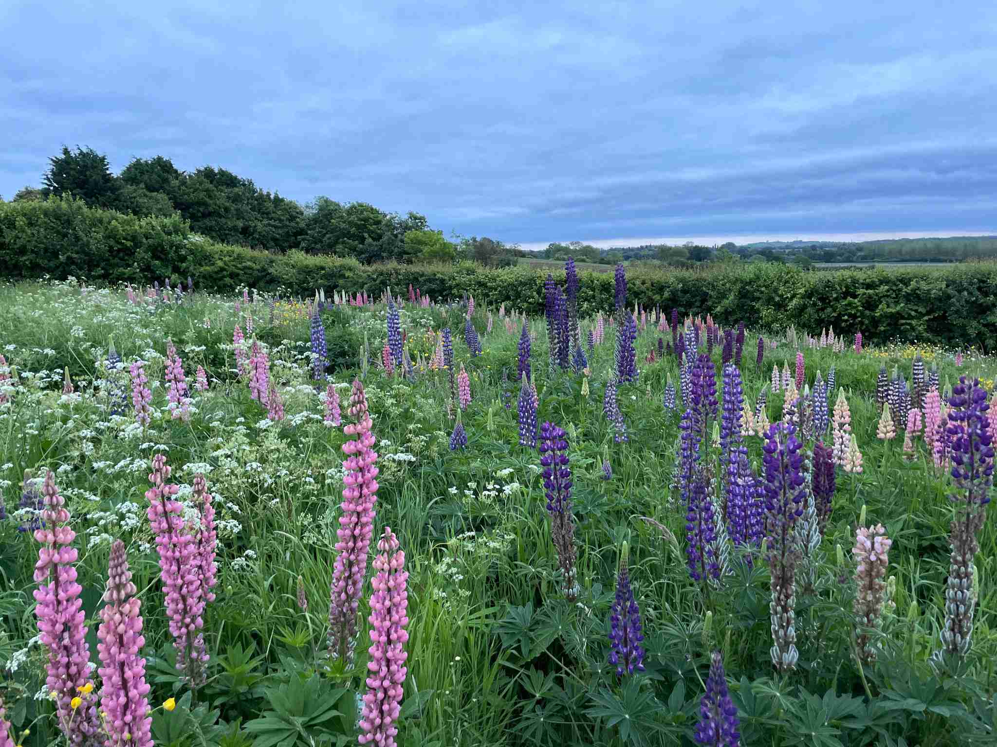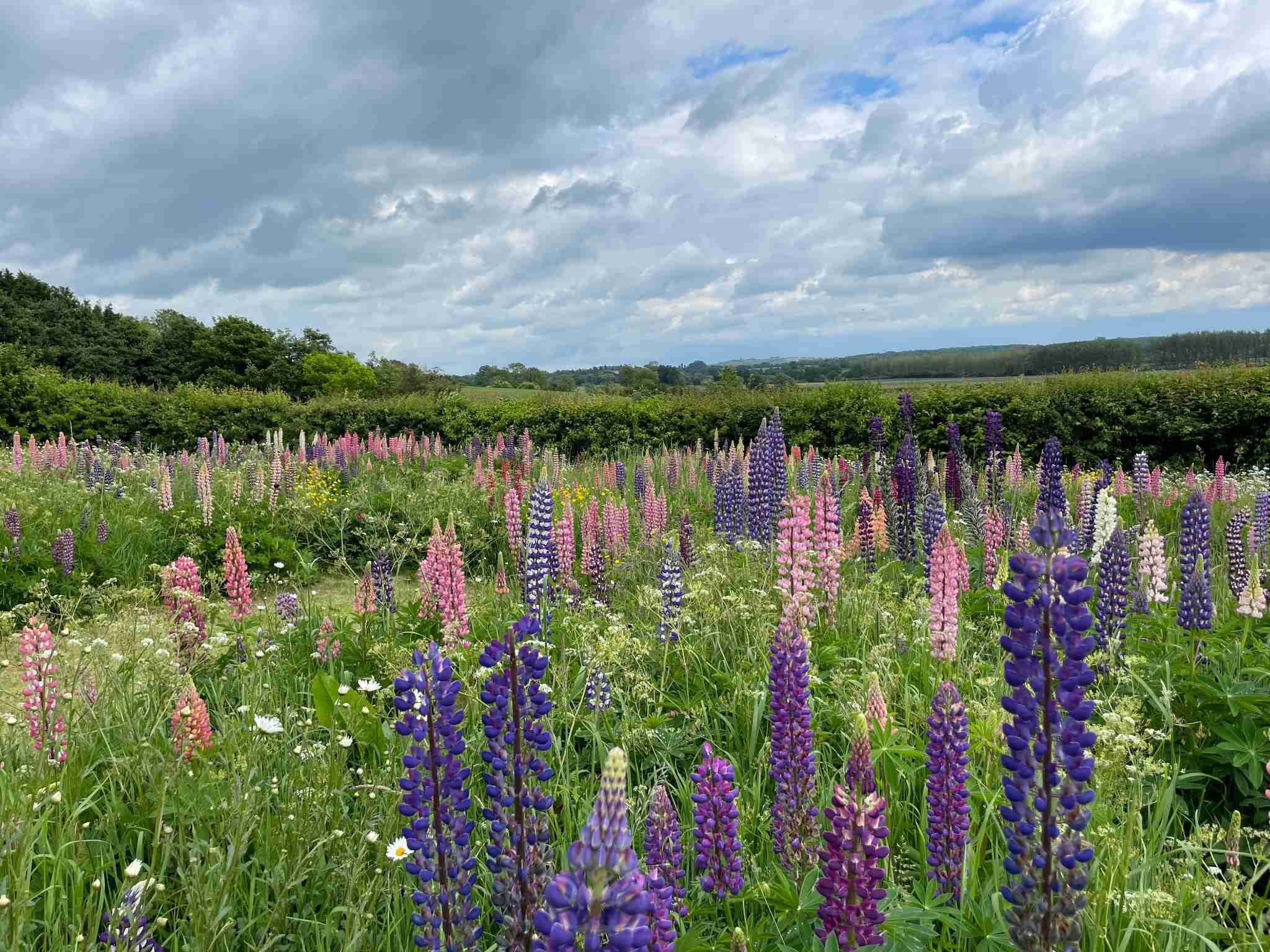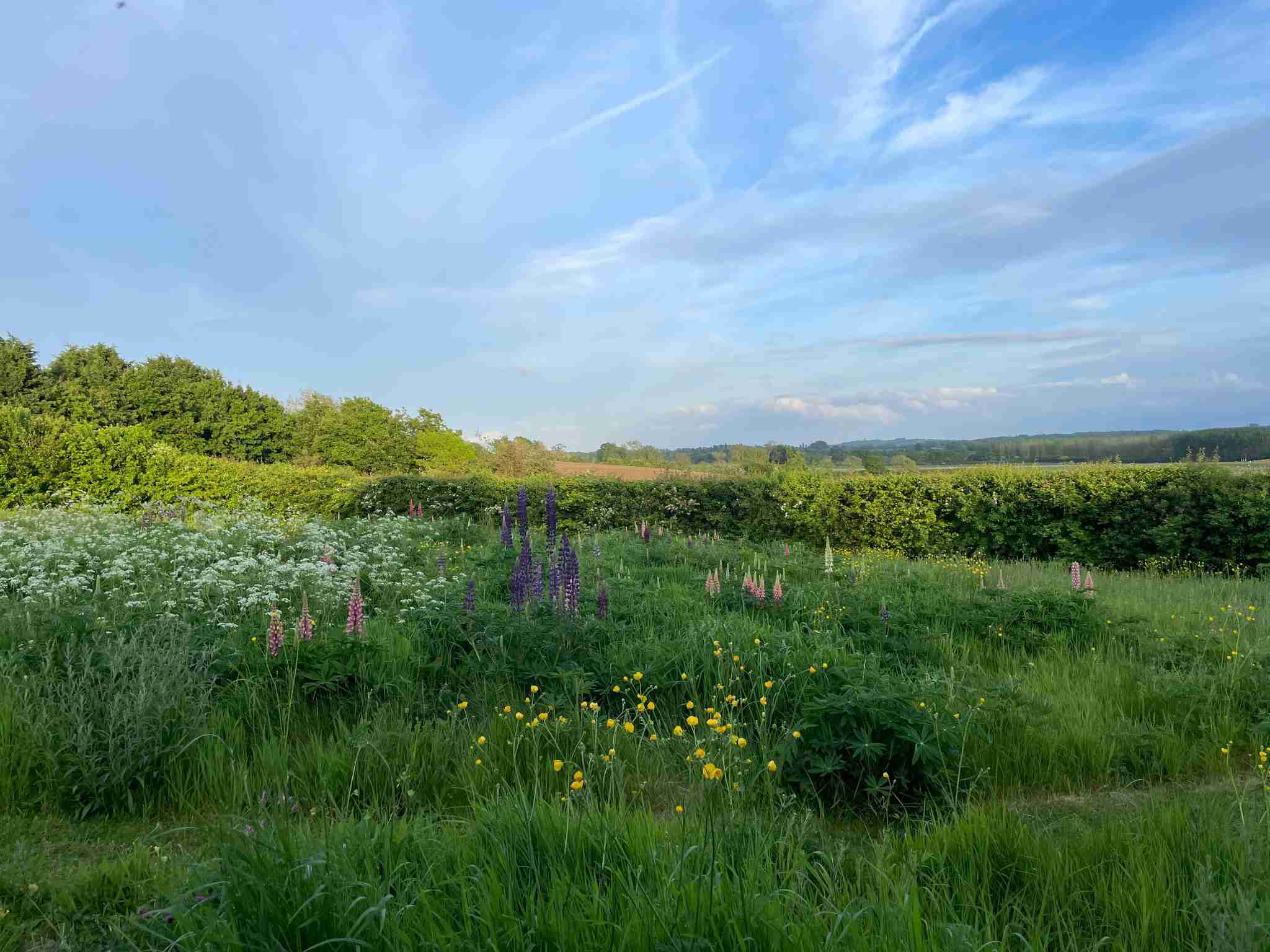 A glorious paddock with naturalised lupins in an array of colours as well as, buttercups, cow parsley and oxeye daisies. The paddock has far reaching countryside views to the south east across arable fields and woodland. The gradient of the meadow allows for some fantastic sunrises across the broad skyline it looks out to.