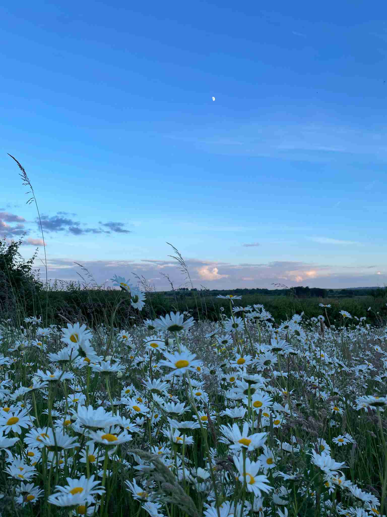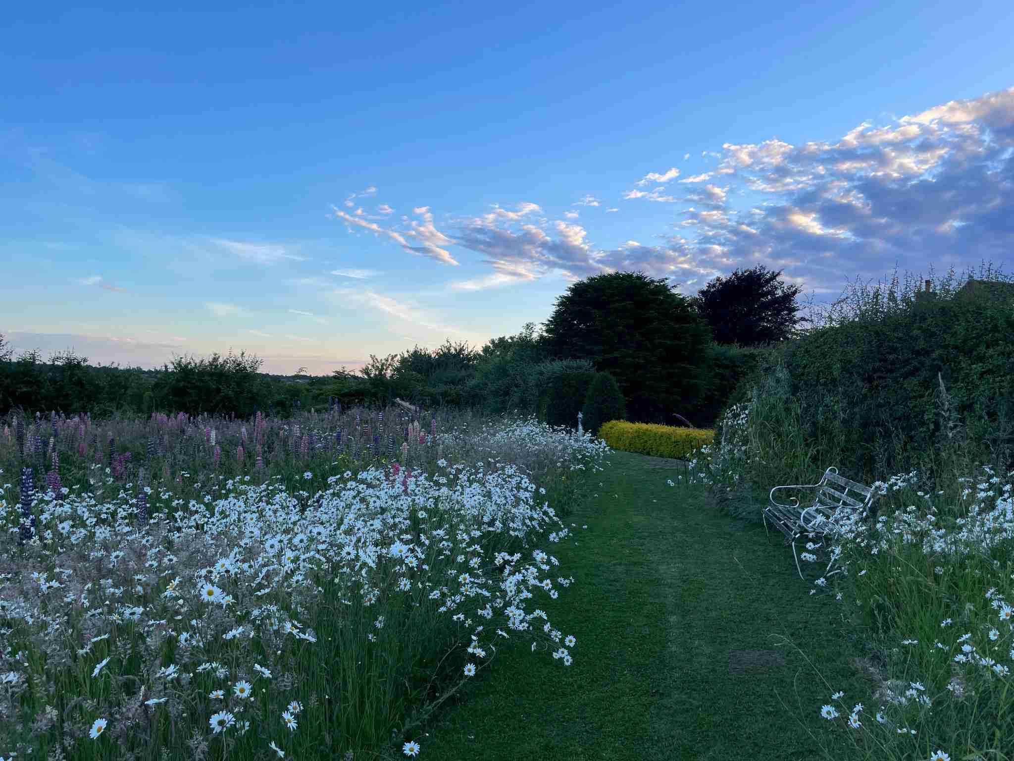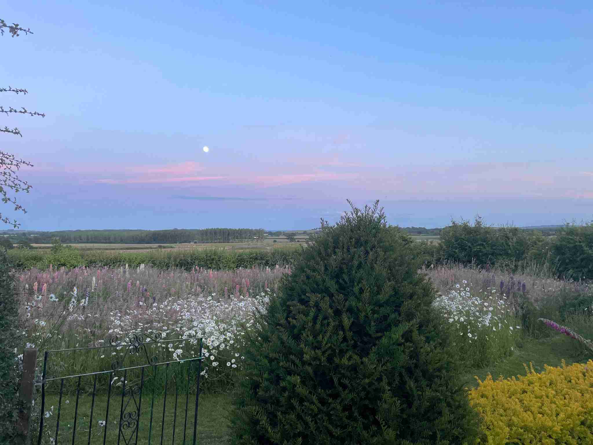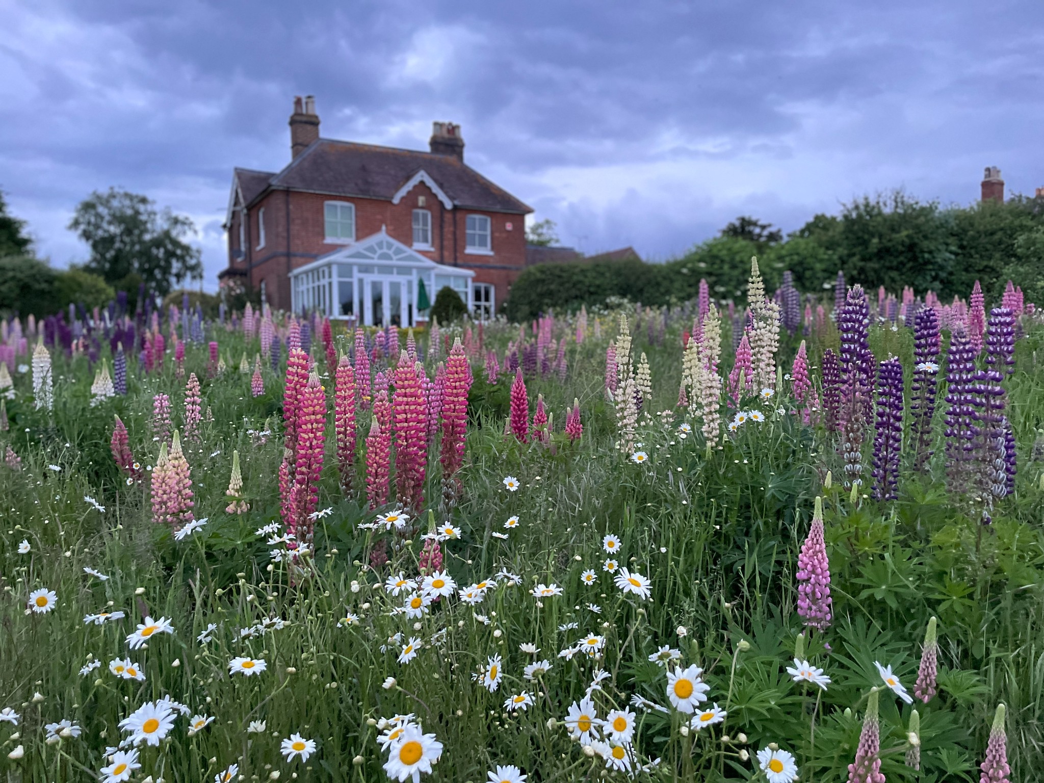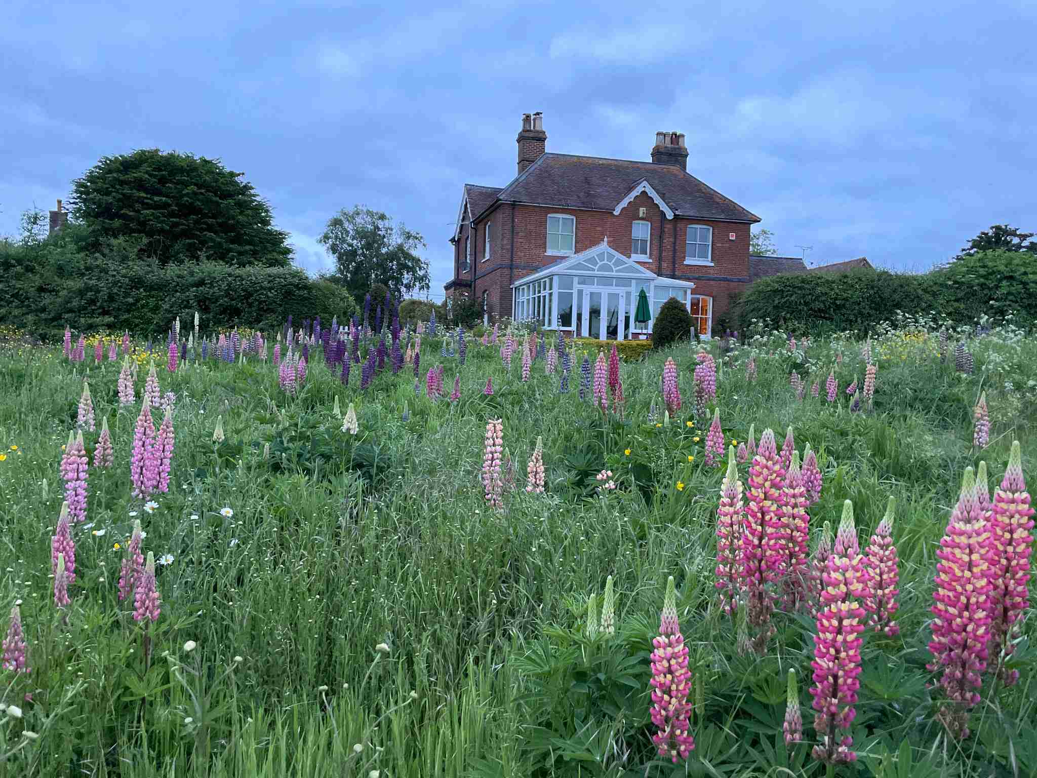 A glorious paddock with naturalised lupins in an array of colours as well as, buttercups, cow parsley and oxeye daisies. The paddock has far reaching countryside views to the south east across arable fields and woodland. The gradient of the meadow allows for some fantastic sunrises across the broad skyline it looks out to.