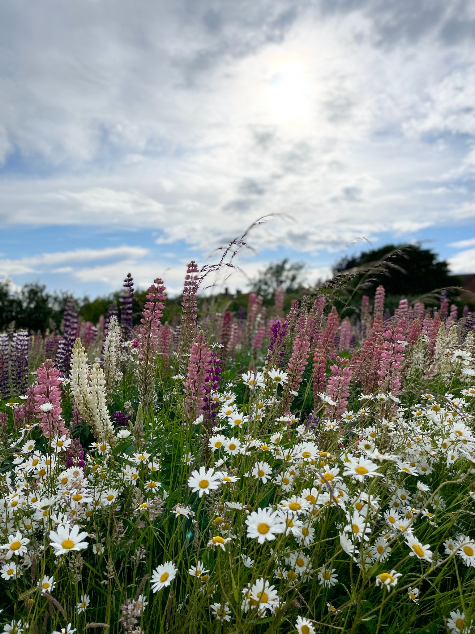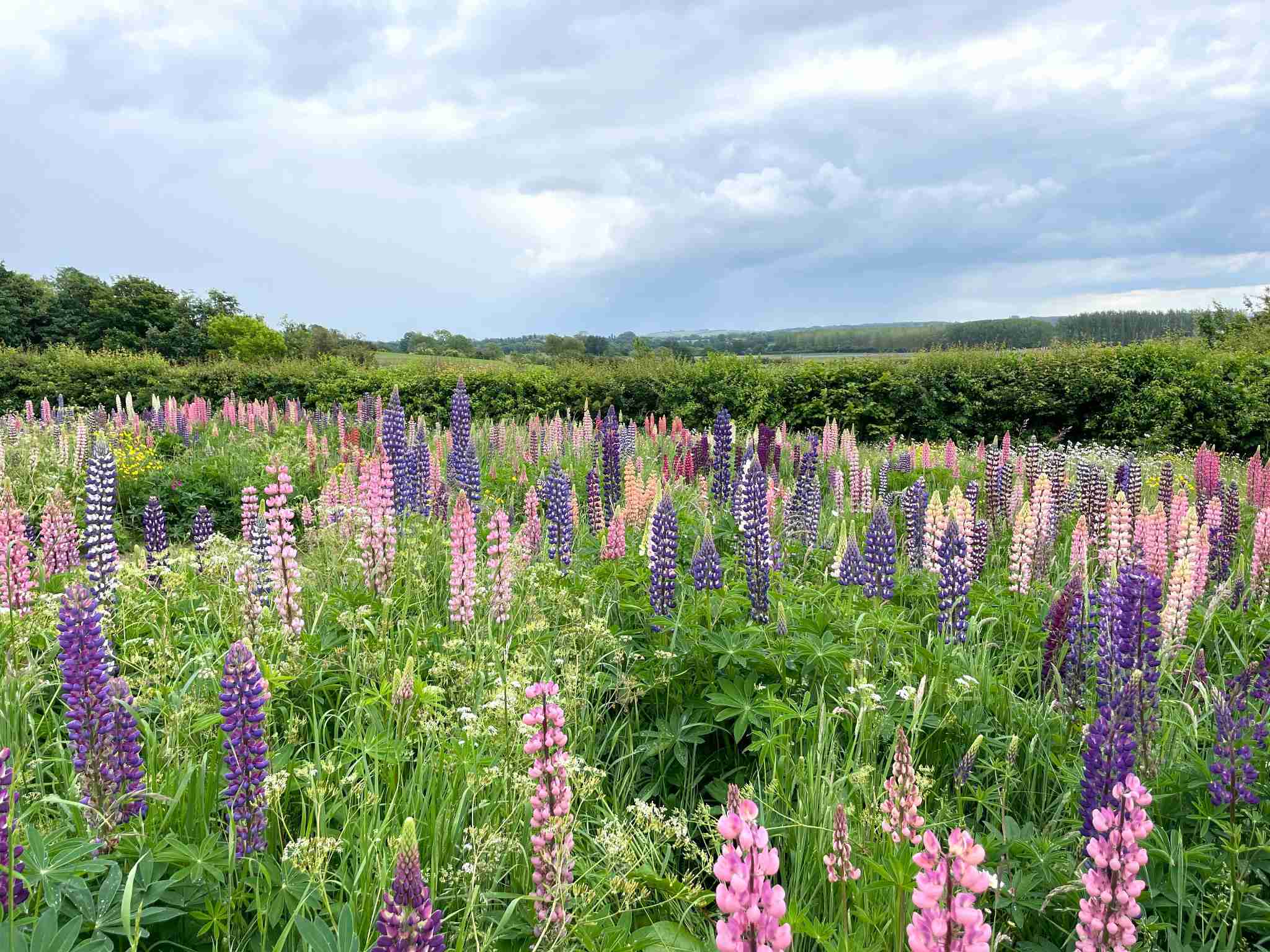 The lupins are initially set off against the striking lush green grass in late May and early June and then soften through June as the grasses dry out by which point the oxeye daisies are bobbing amongst them and give a lovely effervescence. The Lupins fade by around mid June when the meadow has a different, softer feel with only very few lupins left but an abundance of oxeye daisies, buttercups and long dry grasses.